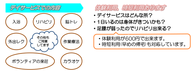 ご用意しています。 - 入浴、排泄、食事等の介護はもちろんのこと、脳トレや機能訓練、レクリエーション等様々なプログラムをご用意しています。みんなで楽しく過ごすことで社会的孤立感の解消にもなります。